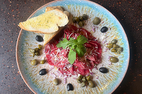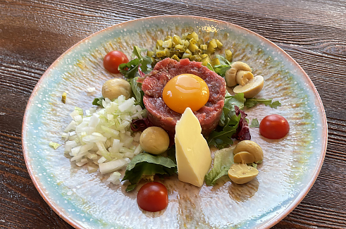 Roastbeefsteak mit 3 Saucen, serviert auf Vulkanstein