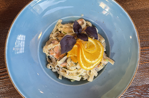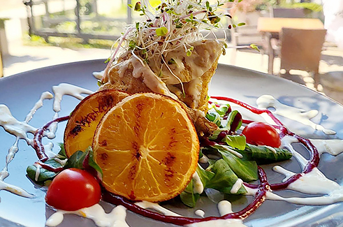 Miruna-Fisch in Blätterteig auf Rucola mit Himbeerdressing gebacken