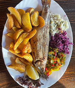 Dorsch auf Piratenart gebackener in Tomaten-Zwiebelsauce